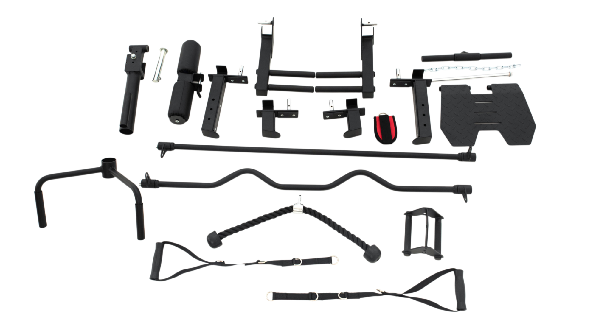 Περιλαμβάνονται επίσης προσαρτήματα μπάρας ίσιας και σχήματος W, καθώς και άλλα χρήσιμα προσαρτήματα όπως σχοινί τρικεφάλων, ιμάντας αστραγάλων & τριγωνική λαβή κωπηλατικής.